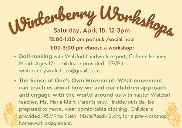 Winterberry families, join us Saturday, April 18th 12- 3 pm for two wonderful workshops from members of the Winterberry community. The event will begin with a potluck and conclude with your choice of two workshops. Childcare provided. Please RSVP to winterberryworkshops@gmail.com.